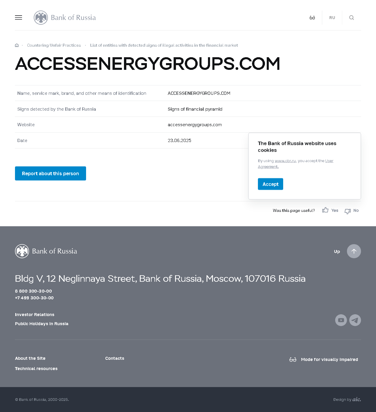 Liste des entités présentant des signes d'activités illégales sur le marché financier ACCESSENERGYGROUPS.COM.