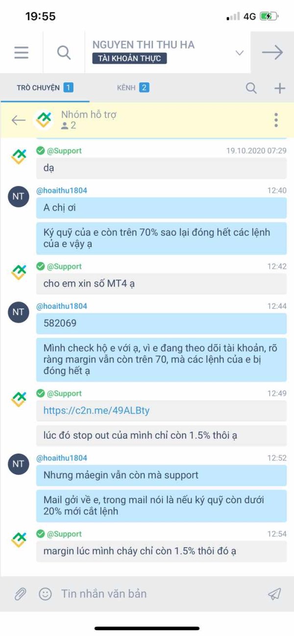 Nạp vào 1000$ vs bonus margin 1000$. Các lệnh của tôi gồng âm nhưng ký quỹ vẫn chưa xuông dưới 20 nhưng lại đóng lệnh của tôi ngay lúc tôi chuyển tiền vào để duy trì vốn, gồng âm. Hỏi support thì đc trả lời một cách qua loa.