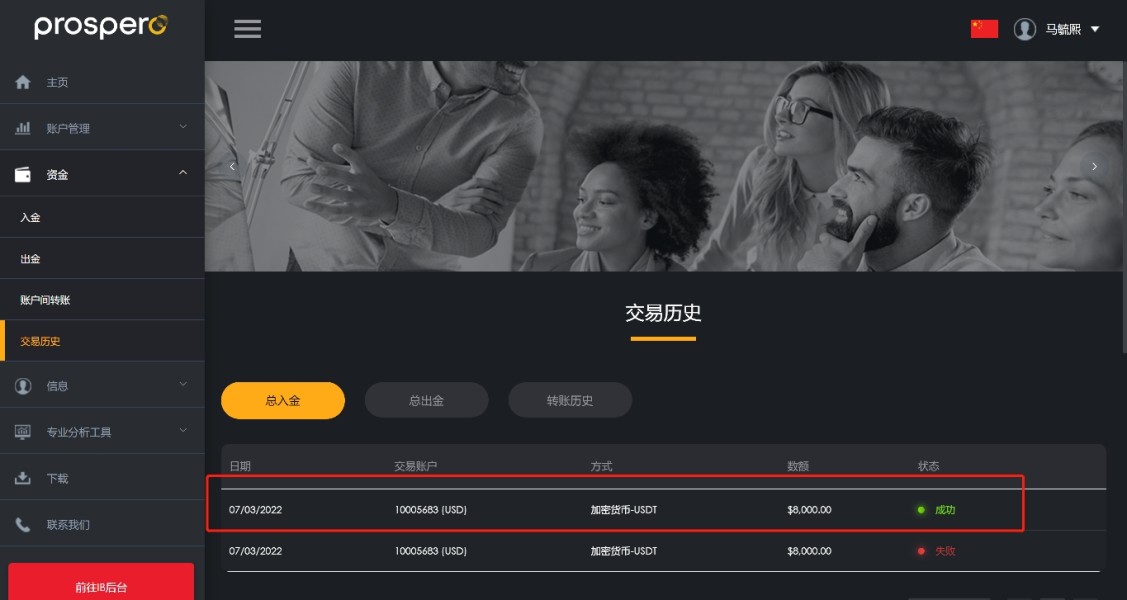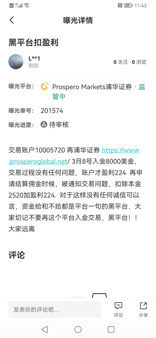 交易账户10005720 再浦华证券 https://www.prosperoglobal.net/ 3月8号入金8000美金,交易过程没有任何问题,账户才盈利224 再申请结算佣金时候,被通知交易问题,扣除本金2520加盈利224. 对于这样没有任何诚信可以言,资金给和不给都是平台一句的黑平台,大家切记不要再这个平台入金交易,黑平台!!大家远离