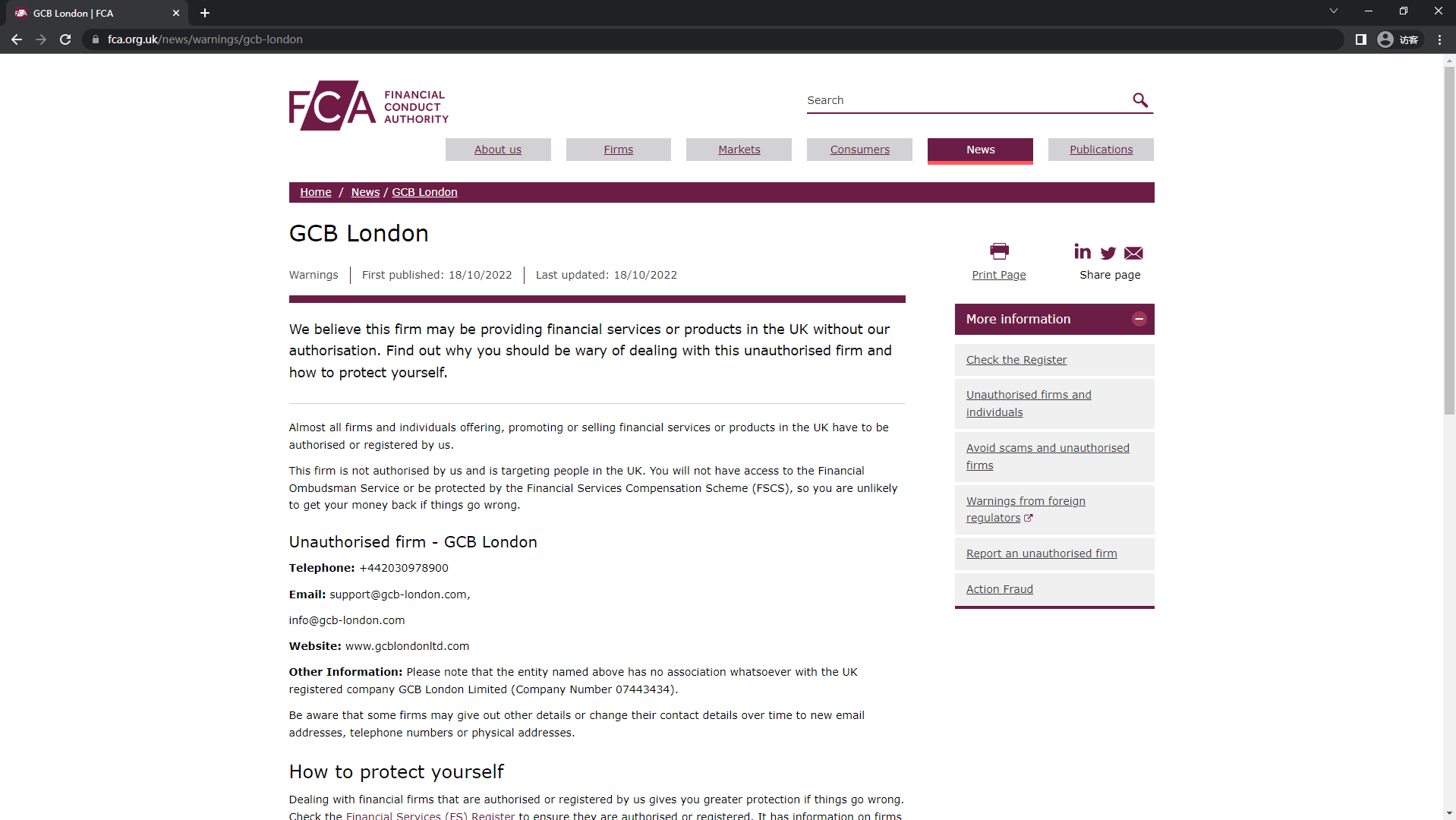 एफसीए की अनधिकृत फर्मों की चेतावनी सूची जीसीबी लंदन.