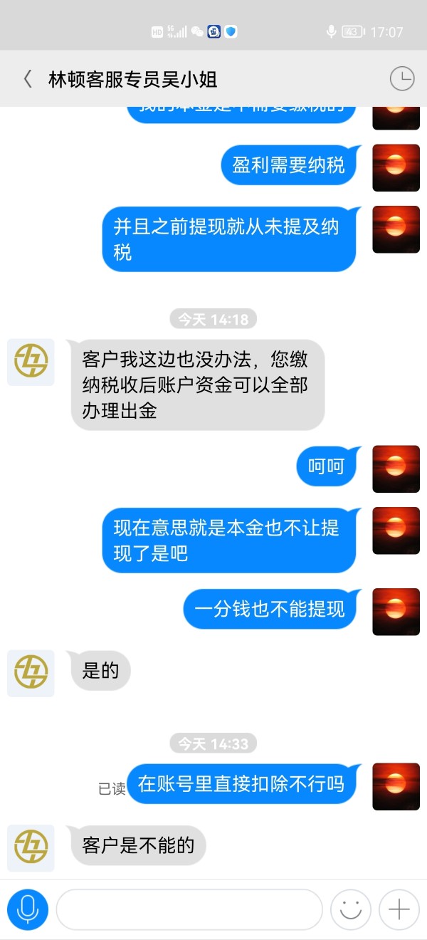 开始以仓位锁定为由,不让出金投诉,之后仓位锁定的问题解决了,现在又要以缴税纳税为理由不让出金,必须要给他交钱之后才能出金,不然本金都不让提现