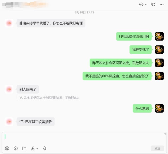 交易过程中被CWG平台投资顾问擅自修改风控、策略逻辑,2026年3月24日本人(交易者)与CWG平台签订的风控为8000美金接受最大浮亏为60%,后被平台擅自修改为100%,签订量化程序为稳健型策略一黄金对冲,后被平台擅自调整参数。由于CWG平台的擅自修改,导致2026年3月27日交易过程中净值10000多美金的账户被修改参数,开仓手数加大,补仓间距加密,触签订的60%风控并未平仓,而是保证金不够被强制平仓,风控达100%,亏损9461美金。