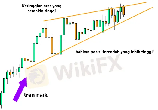 Ini menunjukkan bahwa posisi terendah yang lebih tinggi sedang terbentuk lebih cepat daripada posisi tertinggi yang lebih tinggi. Ini mengarah ke formasi seperti baji, dari situlah pola grafik mendapatkan namanya!