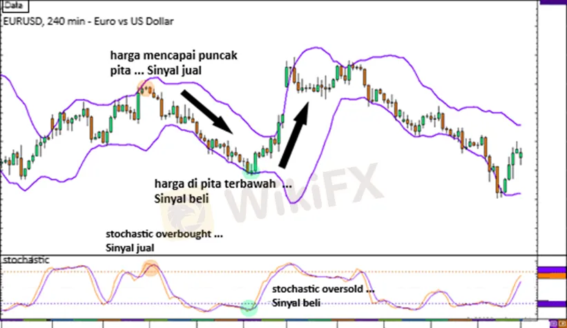 Dalam contoh pertama ini, kita mendapatkan Bollinger bands dan Stochastic pada grafik 4 jam EUR/USD.