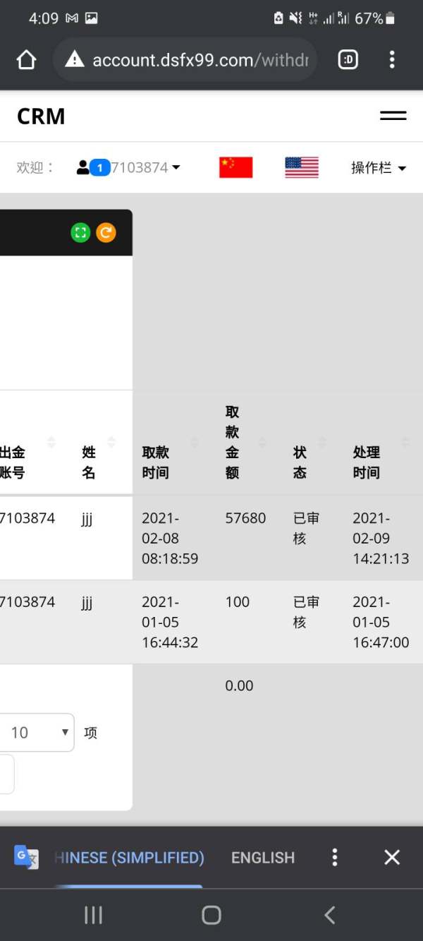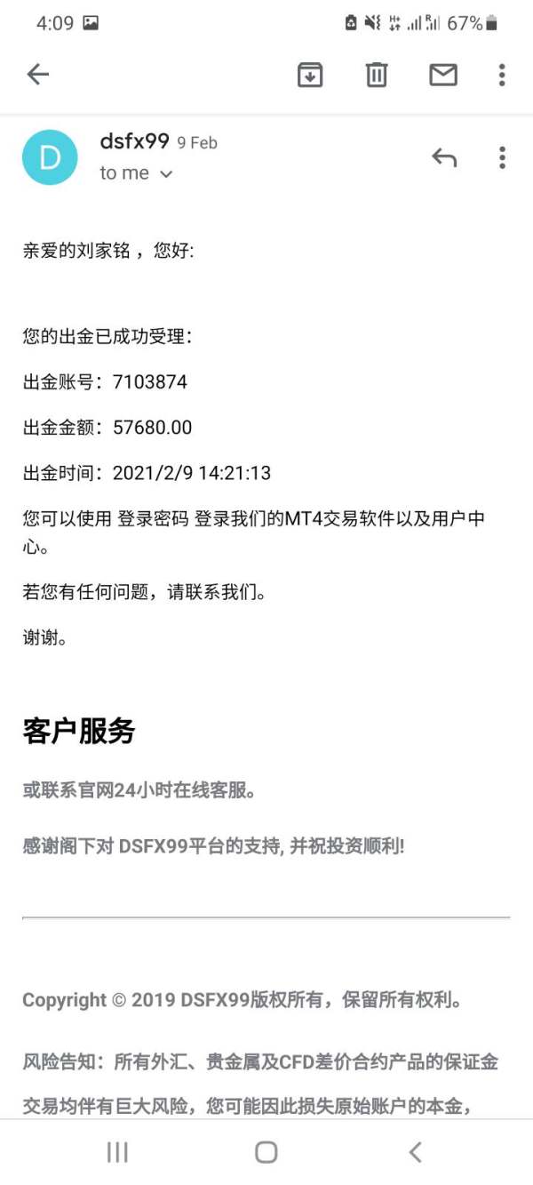 本人在 2020年12月26日 成功申请交易户口在这家DS Investment Limited 的公司,交易了整整2个月 赚多亏损 一开始我也觉得奇怪 哪有那么好的事情 到后来近期我的联系人 (他叫陈晓寒老师) 他告诉我是他们公司要去放年假从2月7日到2月27日 所以让我们把资金都全部提现出来 我也觉得奇怪 就问了他 他说是大家的选择 不过他建议全部提现出来 到时他们上班了 可以重新充值这样达到他们定下的数额 佣金就会少很多 后来我抱着怀疑的态度 也刚好我需要出金 后来他算了算佣金 要我先还20%的佣金 所以是7600多美金 后来我说能不能还一半先 他说需要和他公司确认 (我其实是一位在网上认识的朋友介绍的) 后来他是因为我是朋友介绍的所以就能通融 后来我就先付了3000元美金的佣金 后来在后台申请出金 直到2月9入才审核通过我也收到了电影 后来第二第三天我开始觉得奇怪了 可能需要一点时间才会到账 但直到了今天完全没有收到款项 电邮那个人那个客服中心也完全不能电邮过 老师也联系不上 我朋友也没办法联系上 我感觉已经被骗掉所以的积蓄了 总共 USD 13000 恳求大家帮我讨回我的积蓄