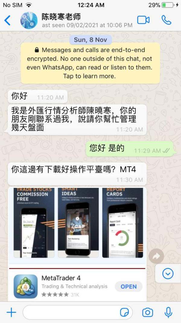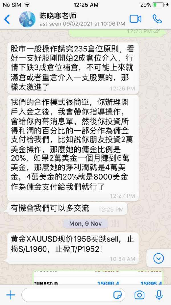 一个自称是中国著名外汇行情分析师 陈晓寒 老师 根本就是老千 专骗钱 说得比唱得还好听 还有一个女的 自称是在中国开旅游公司 无缘无故跑来加我微信 请提高警惕 避免受骗 来历不明的信息和人千万不要去相信 也不要和他们聊天 记得 "贪" 会害了你自己 天下没有不劳而获的事 切记 万勿受骗 成为下一个受害者 本人以自身的经历来向大众警惕 谢谢各位。