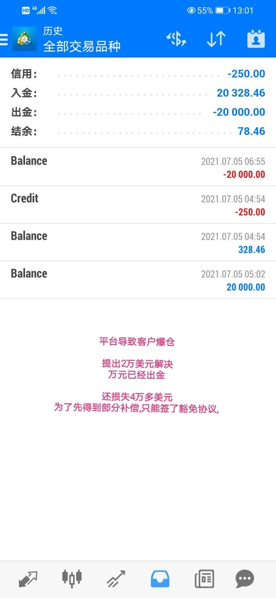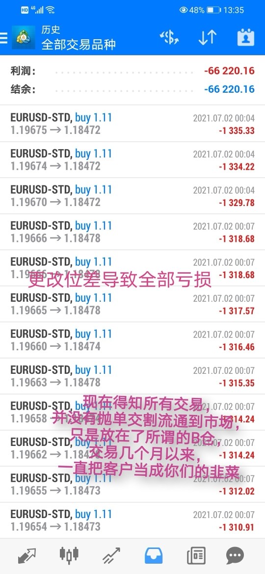 浦华金融 Prospero平台,在2021年7月2日大盘时间0:07分故意改动点位,导致客户爆仓,直接损失6万多美元,这个点位,其他平台根本没有,可以去查看其他正规平台,开盘时点差一度到了120点左右。无底线拉大点差,平台协商赔偿2万美元。无奈,只能先妥协收下!得知平台把账户放到B仓,根本不抛单(有证据,有录音)和平台对赌,就没打算让客户盈利,口口声声说是正规平台,公开透明,不坑交易者,背后却私自改动点位,让客户爆仓,居心叵测,请交易者注意,借贵平台严重曝光,以免更多投资交易者,受到损失