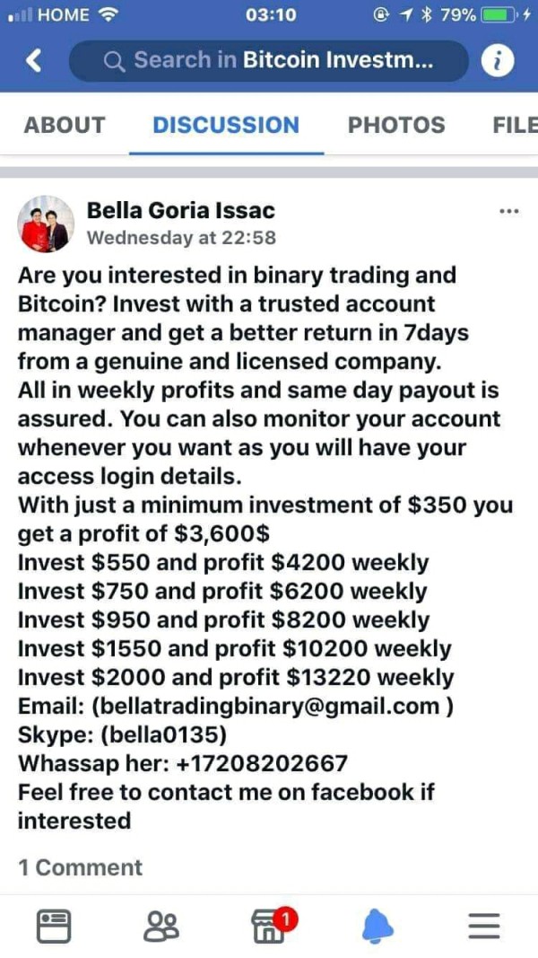 SCAM ALERT Dont allowed this person he ask us to firstly deposit 100$ for the demo account trade this is the first step to scam after I send my 100$ I ask when will start getting my profit but he keep saying that for me to withdrawal I most send him another 200$ for my account to be active I sent him 200$ again after he successfully recieved the money then he blocked me from Facebook