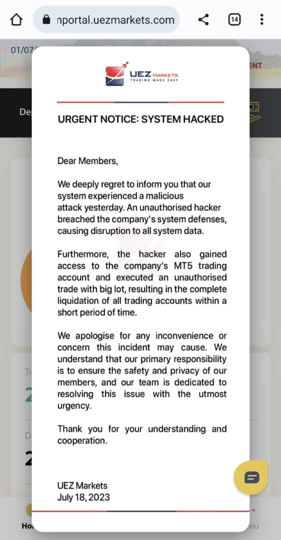 Please put aware to this Broker and they status every 15th and 1st of the month can withdraw, but this 15th of July, we unable to withdraw and we can't log in to our account, but some account can log in, then they come out with this notice about the system get hacked, and this broker are running pyramid scheme, please aware to the public and lowest their point, thank you