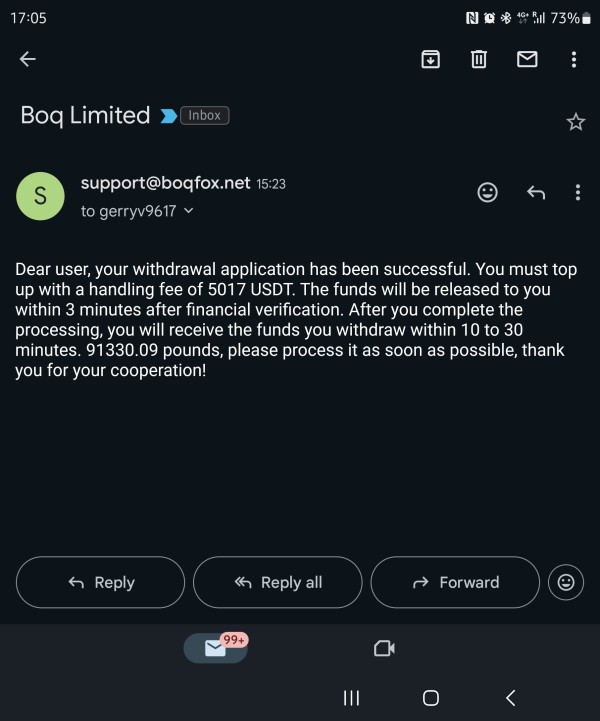 i have made a withdawal of 112,775 USD and its under review. i follow up thru customer service and they advice me that the amount that i have withdrawn cannOT be release due to ID Account Abnormality and needS to recharge to the last amount 3,035 USDT which is being deposited thru OKX via merchants. they explained to me the problem so i was encourage to pay the recharge fee. after a while customer service sent me a message that the are ready to release including the too up payment. however since i agree to release the money i need to pay from my own pocket the amount if 5,017USD as a handling fee and after receiving the payment they will release the money within 10 to 30 minutes. i didnt pay because i realizes ive been scammed already. the last picture on the bottom is their BOQ forex platform and the second one is the log in. this is different from legit BOQ platform which is yellow in color as shown on the last photo