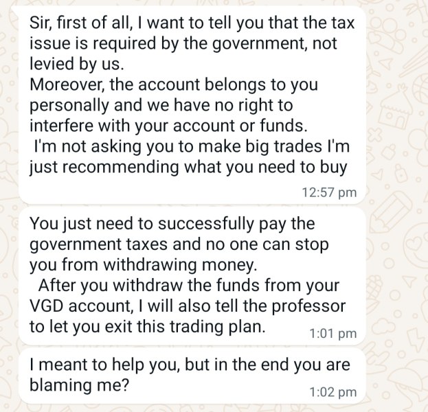 dear sir my name is Rajkumar I am from Salem Tamilnadu, Sir I was being cheated by this VGD Vanguard group club firstly I don't know they are a forgery cheats now my life is totally miserable they have rob all my hard earnings life savings 2 months back I have invested 6 lakh in this Venguard lioring me to buy several stocks , block trades, IPO etc atlast i have 73lakh total in the Vanguard account 15days back I requested to the professor assistant Megan Finlay that I want to withdraw some money to solve my debt , n problems but she said no, you can't withdraw unless you pay the tax for the SIBI of 4.5 lakhs first , I told them I have no money to pay... I even request to the professor n the customer care to debit the tax amount from my vanguard account and pay the tax , they said it's against a law they are unable to debit from my account , sir for the past 15 days this Megan everyday sending message asking me to pay otherwise the account will be freeze , now 2days back the Venguard website is not working it's showing error , even their photos disappear on WhatsApp dear sir if you could please help us in this matter