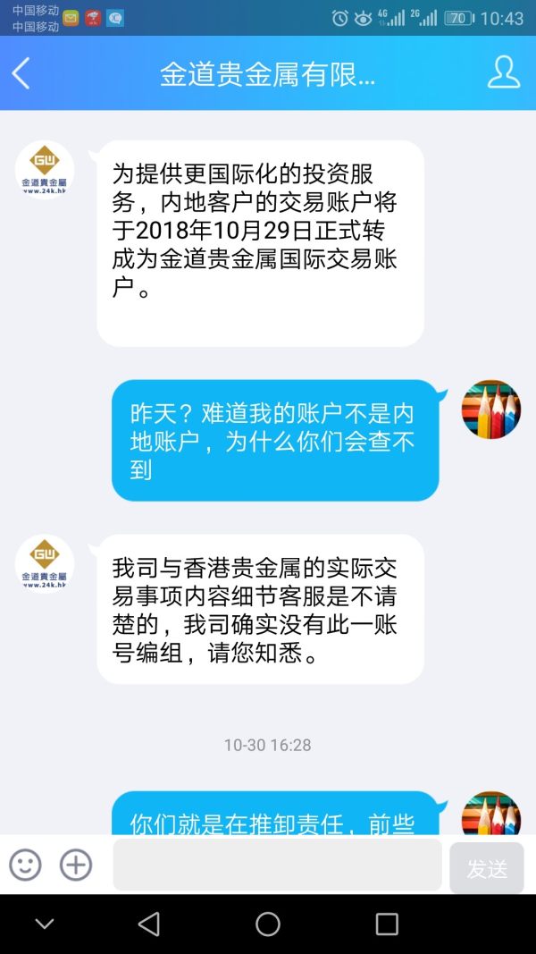 金道贵金属无辜冻结账号,联系他们的客服后还不承认是他们的账户,说查询不到,难道那些入金成功的邮件不是他们发的吗?平台换个名字就不承认以前的客户了,也太不负责任了吧,希望外汇天眼能够曝光他们
