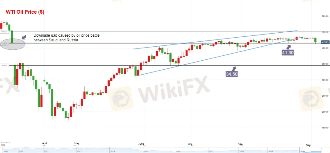 WikiFX Notizie (3 settembre) - Mercoledì, il petrolio WTI è sceso bruscamente da un massimo di 43,20 dollari USA a un minimo infragiornaliero di 41,23 dollari USA, segnando il più grande calo di un giorno in tre mesi. I prezzi del petrolio durante la notte sono scesi leggermente al di sotto del supporto chiave di $41,30 e poi sono rimbalzati, attualmente mantenuti sopra $41,30 per il consolidamento.