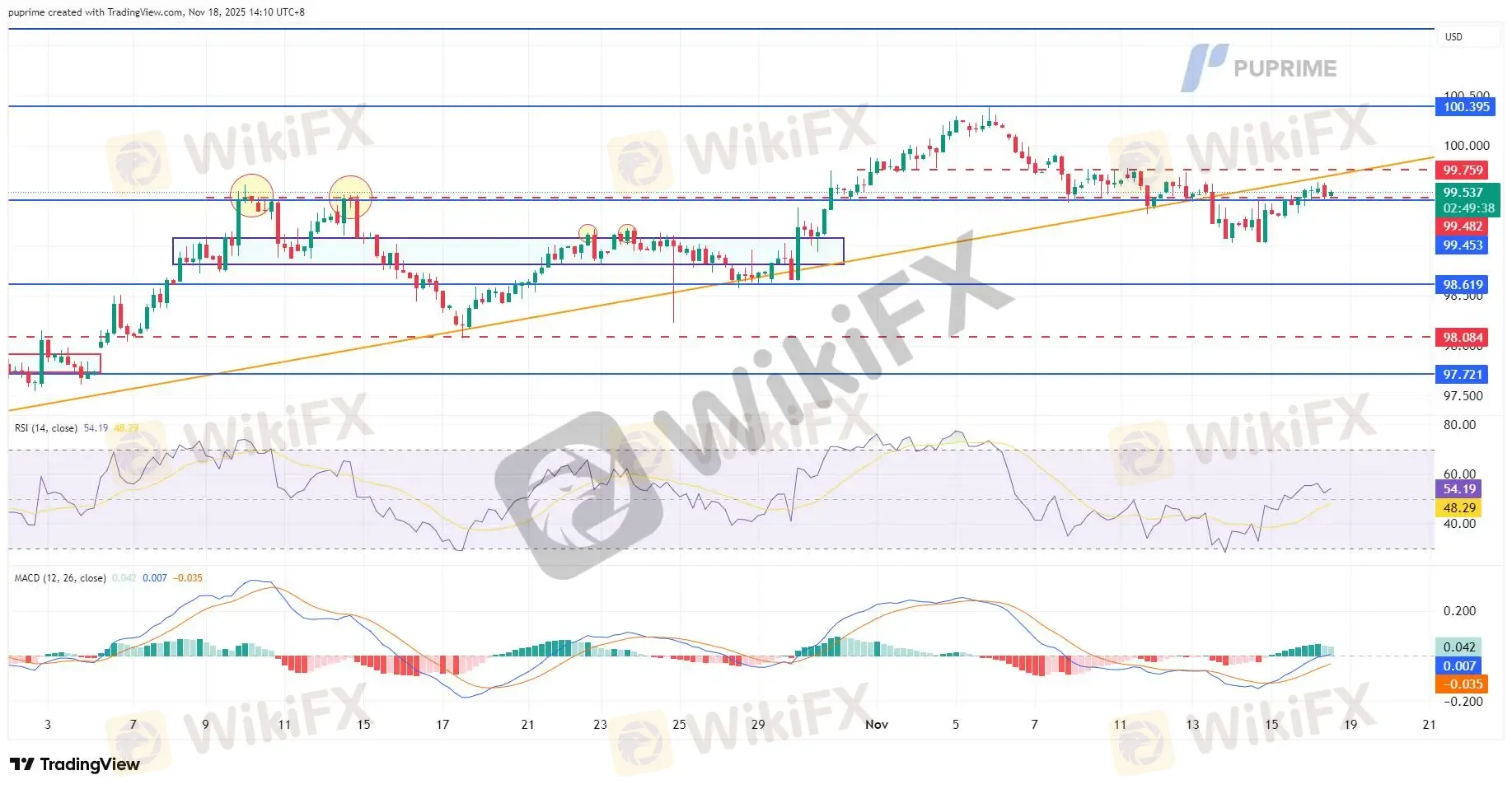 A confirmed breakout above 99.55 would open the path toward the next resistance at 100.25, reinforcing a short-term bullish trend.