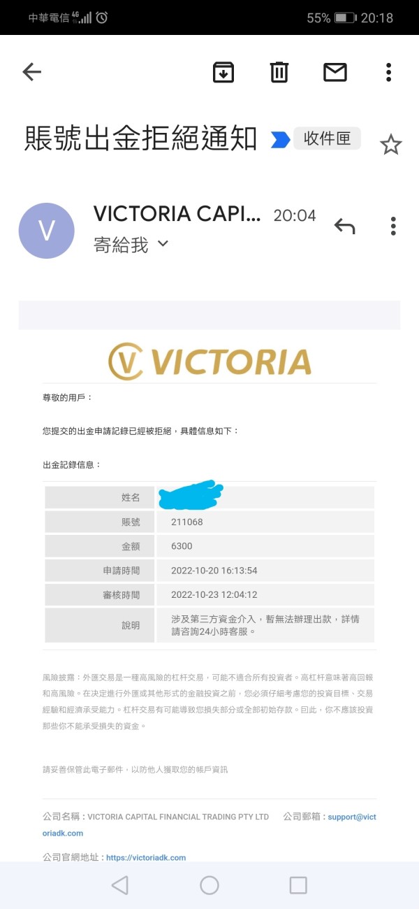 9月20日辦理提金,9月23日收到拒絕出金信件