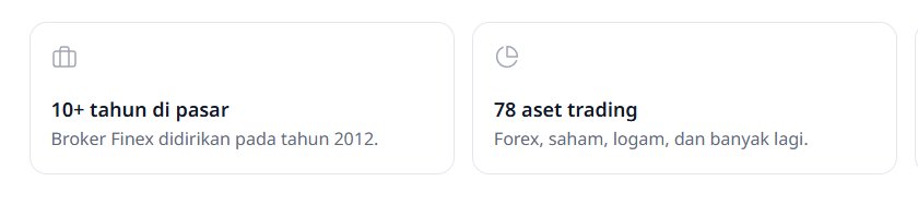 Saya mencari broker yang bagus, dan kriteria saya adalah broker yang sudah beroperasi lebih dari 10 tahun. Akhirnya, saya menemukan Finex, yang ternyata sudah berdiri sejak 2012. Itulah alasan utama saya memutuskan bergabung. Selain itu, mereka menawarkan 70+ aset trading, jumlah yang menurut saya lebih dari cukup. Saya senang karena kita punya broker dengan kualitas seperti ini di Indonesia 😎