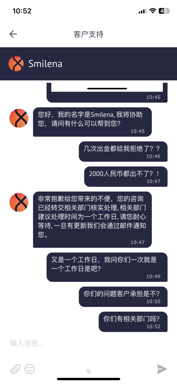 我问他们为什么出不了金,每次都是说提交相关部门,每次都让我等一个工作日,每次都是同样的话术,也没有人回复我是怎么回事。