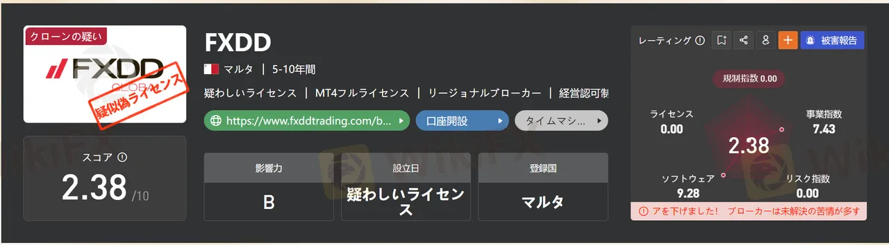WikiFXで検索すると、FXDDの金融ライセンスが疑わしいことが分かります。スコアはわずか2.38点と非常に低い評価です。