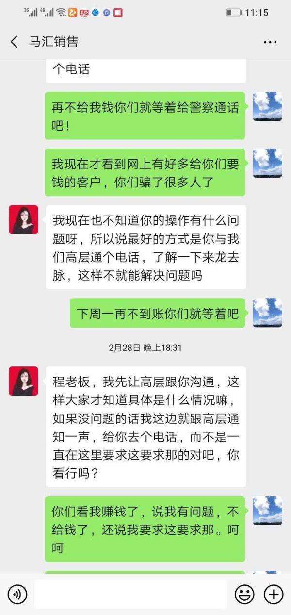 我于2020年2月底在马汇平台销售的引导下开户,本人入金3万美金,鉴于疫情和本人的判断,我用重仓赌黄金上涨的趋势,果然黄金因为疫情大涨,盈利到12万6千美金,打算出金的时候,马汇销售推脱不给出金,后来说我身份证过期,让我重新提交新的身份证,我也重新提交了身份证(我想问一句,为什么等到出金的时候才告诉我身份证过期呢?入金的时候不说?)再往后就让我等,再没有任何征兆的情况下,平台也没有任何人通知我,就把我的交易账号给封掉了,后台也无法登录。包含本金一共有12万6千多美金,马上询问销售,没有任何回复,后来又说我不符合操作,天杀的马汇,到最后一直不回复我信息,告诉我,手机掉了,微信收不到我的信息!现在我联系不到平台的任何人,我用亲身经历告诉广大投资者,警方已查出,马汇是许伯翔带领的诈骗团伙开设的黑平台,(下面有许伯翔百分百股东注册的香港公司)切勿再有受害者上当!!!我已经报警并且立案了(下面有我的立案告知书,里面有办案民警的电话,没有报案的请联系我协助报案)法网恢恢,疏而不漏。马汇你以为你跑的掉吗?抓紧把我们受害人的钱全部给我们!!!本人QQ号:3132****97