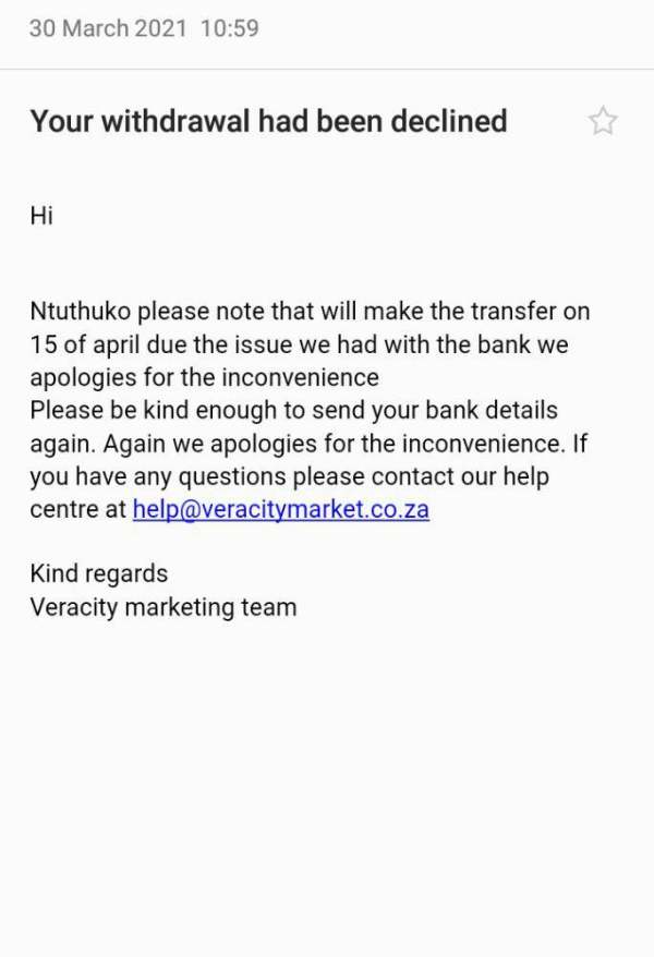 Veracity Markets has been keeping me waiting on my withdrawals, at first they said they changed the bank details. Then after that they said they have technical banking issues and later last month they promised to fix withdrawal problems by 15th April our withdrawals will successfully but still nothing.