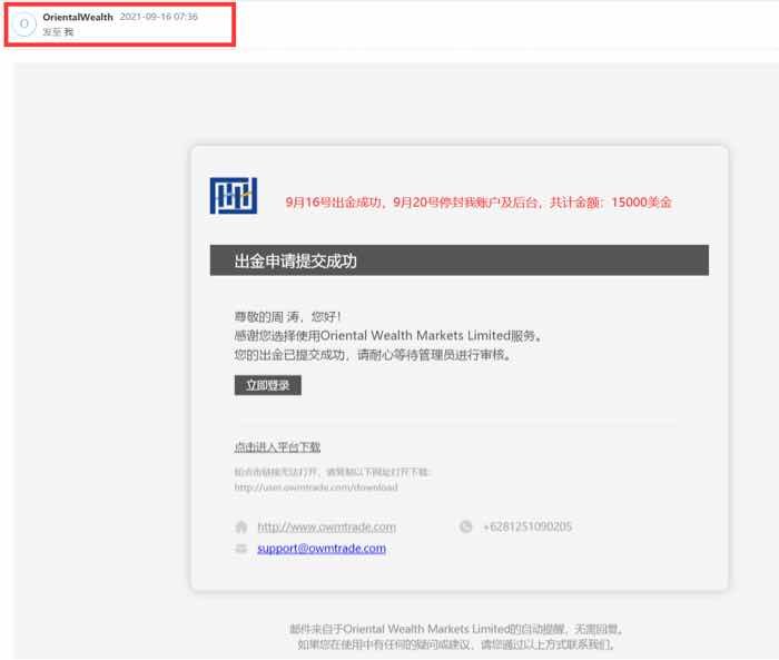 本人入金3000美金,前面盈利共出金13000美金,9月20号收到平台通知,说我账户违规操作将20号订单视为无效,如果业务员说除了20号的订单其他资金明天可以申请出金,结果21号就被禁止登陆,希望各位投资者擦亮眼睛!