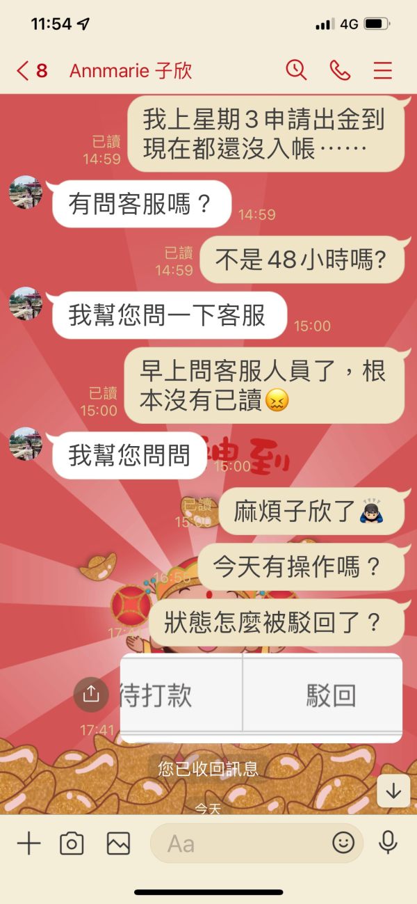 剛開始要你加入會員入金操作時會讓你出金一小部分,然後慢慢引誘你投入更多資金,最後等你資金全部投入後客服人員就會不理睬妳,然後跟助理反應根本不理會,最後等你登入網站時就會發現帳號被封鎖無法登入,MT4APP也被停用,請大家小心以免上當受騙