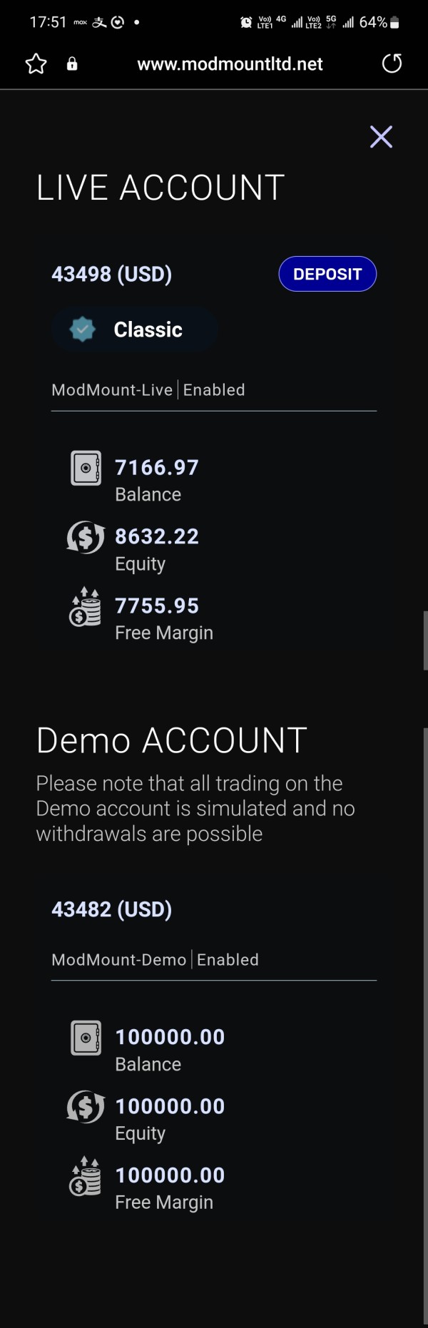 本人2月中在社交軟體Facebook被誘騙入局留下個人資料,其後Modmount Services Ltd人員致電本人說已經替本人開了户,之後不停施壓本人入金,並全程由該公司2位人員(一叫Mark, 另一叫羅伯特)(下稱公司代表)替本人操盤交易(完全未經本人同意),本人多次入金共13,000多美金,之後該公司代表強行替本人操盤並刻意虧損(只設定止盈沒有止損)本人資金,虧損至近7千美元,本人曾多次要求止損不果,最後本人强行平倉及要求出金(提款),但Modmount毫無理由完全拒絕我出金。