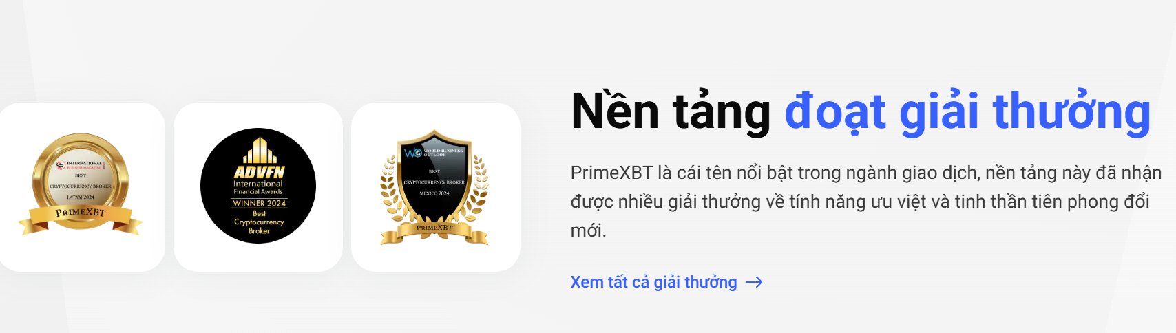 Ngoài các phản hồi tích cực về PrimeXBT, tôi khuyên bạn nên xem tủ trưng bày cúp của họ. Sàn này được công nhận rộng rãi là một nền tảng giao dịch hấp dẫn.