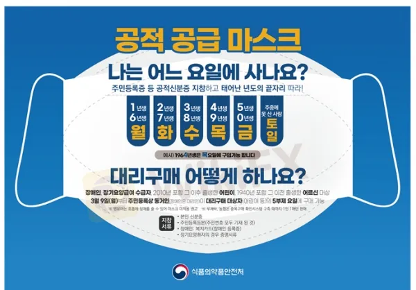 마스크 수급 문제로 정부가 고심한 끝에 채택한 ‘마스크 5부제’가 오늘부로 처음 시행되었다. 5부제 시행 첫날인 오늘 오전 각 지역 약국마다 공적마스크 판매 시간 안내문이 붙어 있다. 약국에서는 월요일은 태어난 해 뒷자리가 1년과 6년 화요일은 2년과 7년, 수요일 3년과 8년, 목요일 4년과 9년, 금요일 5년과 0년으로 출생 연도가 끝나는 사람들이 하루 최대 마스크 2매를 살 수 있다. 구매시 반드시 주민등록증 혹은 여권, 운전면허증 등 신분증을 지참해야만 구매가 가능하다. 또한, 만 10세 이하 어린이와 만 80세 이상 노인에 한해서 대리구매가 가능하지만, 본인 신분증과 본인 및 대리구매자가 함께 등재된 주민등록등본을 제시가 필수다. 마찬가지로 장기요양급여 수급자도 장기요양인증서를 제시하면 대신수령이 가능하다. 5부제 해당 날짜에 구매하지 못하면 주말 이틀을 활용하여 출생연도에 관계 없이 2매를 구매가능하다. 약국마다 공적 마스크 공급 시간과 다르므로 판매 가능 시간은 모두 다를 수 있다. 한편, ‘마스크 알리미’ 앱으로 마스크량을 체크할 수 있어 더이상 예전처럼 길게 줄을 서서 마스크를 구매하는 현상이 줄어들 것이라 기대하고 있다.