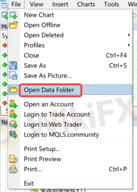 MT4/MT5 데스크톱 프로그램을 열고 메뉴에서 [파일] ---> [데이터 폴더 열기]를 찾습니다.