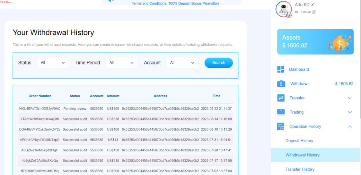 Платформа пару дней назад перестала отвечать на запросы.. вывода личных средств, статус платежа постоянно в обработке. сумма зависших личных средств 1606,82 $ прошу помчь вернуть личные деньги