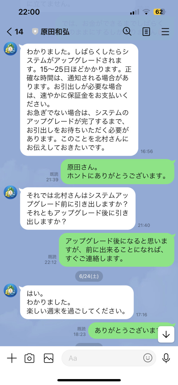 当初、CBXIで取引をしており、そこから出金しようとしたが、口座凍結をされてしまった。口座凍結解除に口座残高の10%を振り込めとの指示であったが、金額が用意できずそのまま放置された。 そのうちCBXIへはアクセスできなくなりました。その後同じブローカー(原田和弘と名のる)からLINEが入り、IBUTOKAに口座残高が移管されるので、そのアクセス権を得るため10万円を払えとのこと。払うと今度は、長い期間凍結されていたので、解除するため20万円払えとのこと。20万円払ったら口座がIBUTOKAにら作られ、残高はいろいろあったが移管された。出金しようとすると出来ない。先に利益分に対する税金を20%払えとのこと。全額は,難しいので、方法を提案してくれとの問いかけに、先にまず100万円払って600万円弱を引き出すようにとの指示であったが、まだ出金できず、ブローカーの原田とも連絡が取れない。エビデンスのやり取りをアップロードしたいが、昔アップロードした写真が残っており,新たな写真がアップロードできません。なんとか口座のお金を取り戻したいので、受付てもらいたいです。