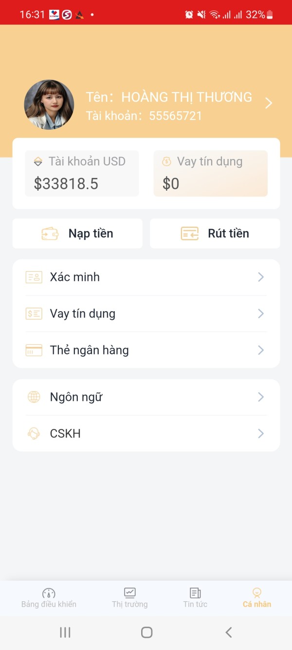 Tôi tham gia giao dịch tại nền tảng IG từ ngày 27/12/2023, tài khoản số 55565721 với tổng số các lần nạp tiền khoảng 12,000usd. Tôi thử rút số tiền nhỏ trong nền tảng IG 2 lần đầu thì được. Khi tôi đã có lợi nhuận tôi rút lần 3 thì nền tảng bắt tôi nạp tiền Vip mới cho rút, tôi thấy điều này hết sức vô lý và tàn ác. Giờ tôi không có tiền nạp Vip vì số tiền nạp nó quá cao, cao hơn cả số vốn tôi đã nạp vào nên tôi không có khả năng nạp để có thể rút được tiền đồng nghĩa với việc tôi sẽ mất trắng tài khoản. Vui lòng hỗ trợ tôi rút tiền. Nếu không rút được tôi sẽ chết mất.