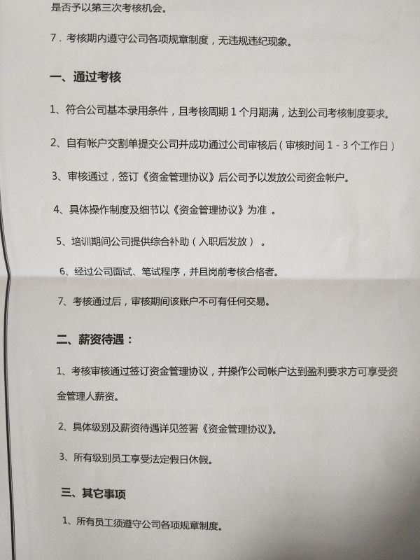诱骗,外汇小白,学习短暂一周时间,参加公司考核。如果模拟过不了,可以考虑自己入金后,再交易,如果通过进入公司,亏损自己承担。让自己交易,不能有任何人指导交易,还规定30%的标准手,每天必须交易两次,对于一个外汇小白,这就是坑人,划点严重,正值的库存费看不到,有一定培训机制,但是,对于新人小白,几乎没用,亏损了说你没有按照交易计划执行。最小开仓和平仓都是0.1手,只有公司自己的EA能开0.01手。