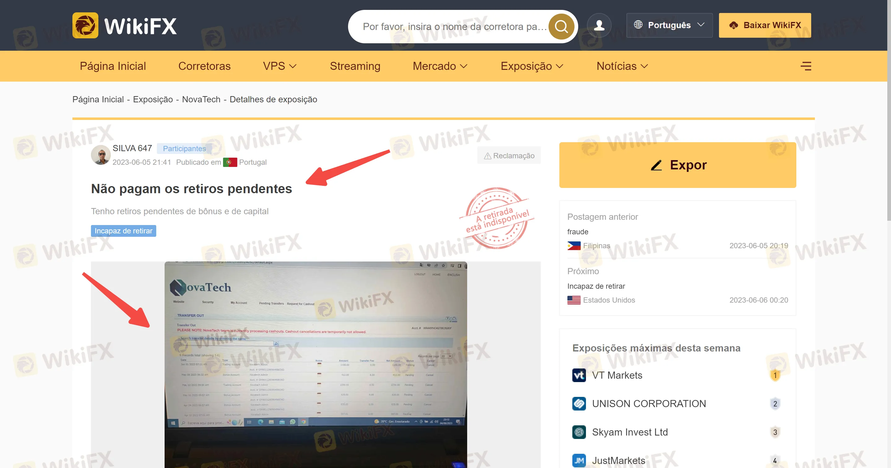 De acordo com o site oficial e o App Smartfone da WikiFX, em 5 de junho de 2023, um investidor de forex em Portugal informou que seu dinheiro na corretora Nova Tech não poderia ser retirado. A captura de tela da página da Nova Tech fornecida pelo investidor mostra: OBSERVAÇÃO: A Nova Tech está processando saques no momento, cancelamentos de saque temporariamente não são permitidos.