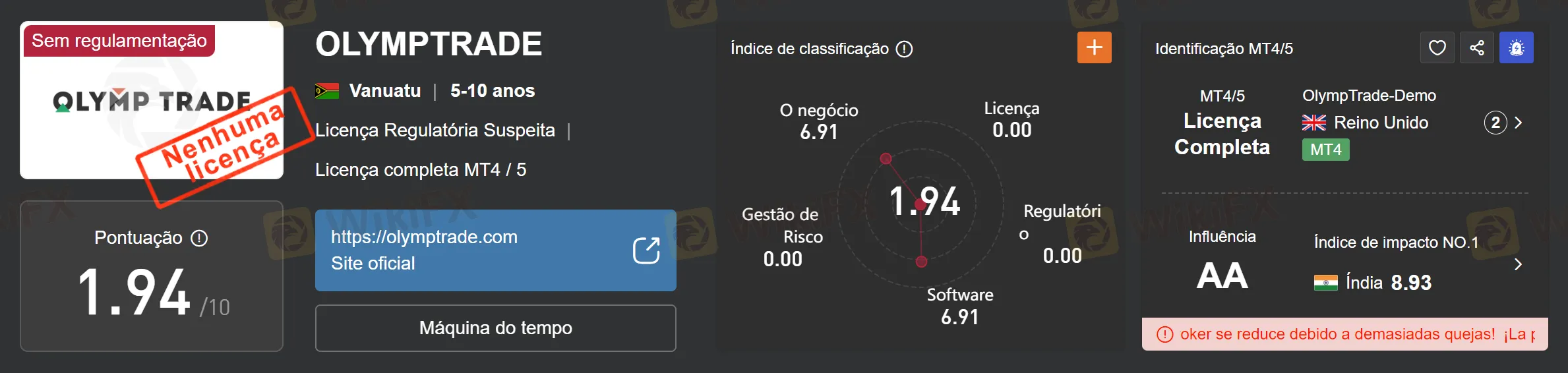 A WikiFX é uma plataforma líder global de serviços de informação da indústria de forex de terceiros, utilizando extensa acumulação de dados e tecnologia avançada. Ela ainda conta com uma equipe especializada e criteriosa sobre avaliação das corretoras disponíveis no mercado, e de acordo com pesquisas e critérios rigorosos a corretora OLYMPTRADE não pontua bem, muito abaixo da média, dessa maneira não é recomendado criar uma conta da OLYMPTRADE.