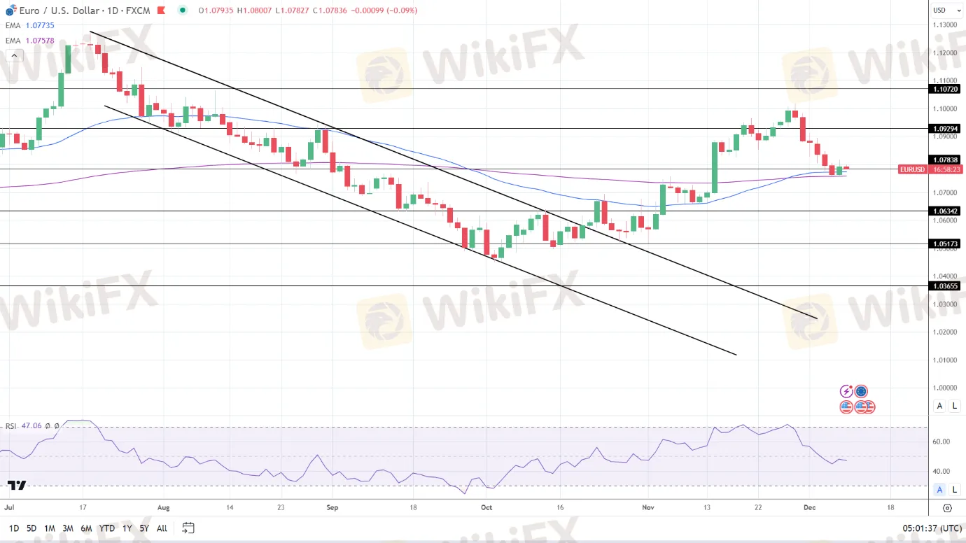 Uma quebra do EUR/USD acima do nível de resistência de $1,07838 e da EMA de 200 dias daria início a uma corrida dos touros em direção à EMA de 50 dias.