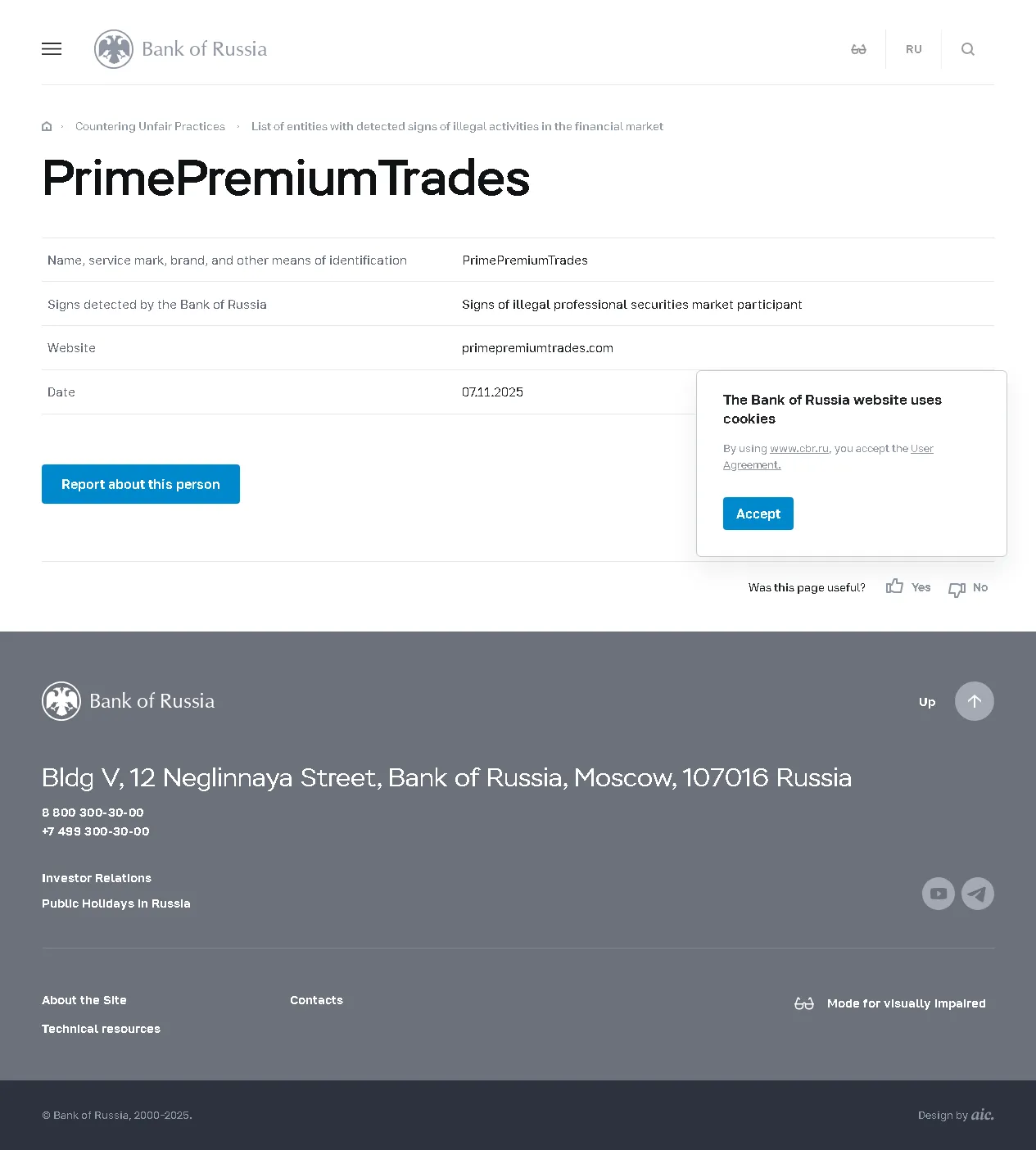 Lista de entidades com sinais detectados de atividades ilegais no mercado financeiro PrimePremiumTrades.