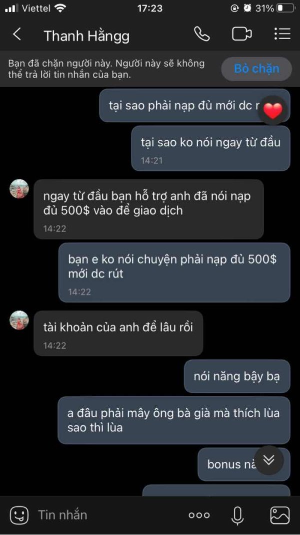 Sau khi nạp 340$ vào tài khoản. Tôi đã tự giao dịch và kiếm được một ít lợi nhuận. Nhưng khi tôi yêu cầu được rút tiền thì họ bảo rằng tổng tiền tôi phải nạp là 500$ mới có thể hỗ trợ tôi rút tiền. Trong khi trước đó họ không đề cập đến việc phải nạp đủ 500$ mới có thể rút tiền. Sàn GICC FX là một sàn giao dịch đáng ngờ.