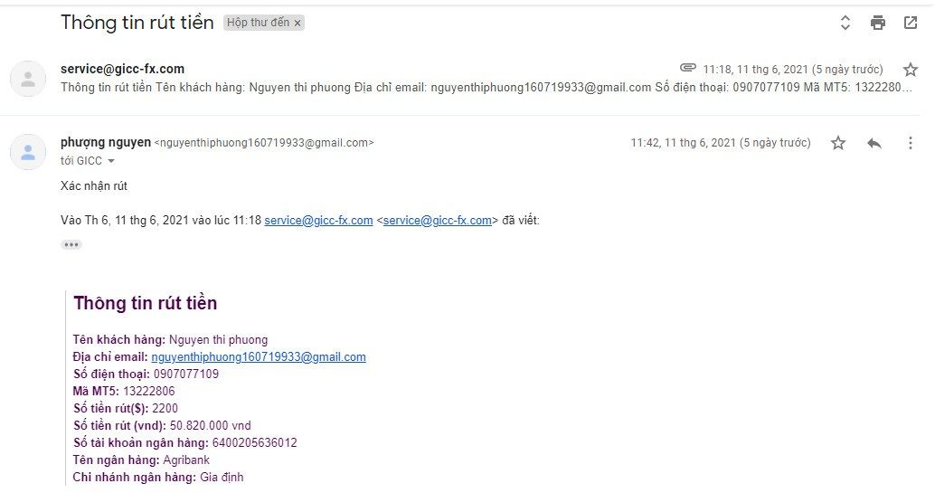 Tôi tên là Nguyễn Thị Phượng, tôi đã và đang giao dịch tại sàn được 1 thời gian, số MT5 của tôi là 13222806, vào ngày thứ 6 tuần trước ( 11/6/2021 ) tôi đã làm 1 lệnh rút tiền khi xác nhận lại với sàn chỉ muốn rút phần tiền vốn 2.200$ và để lại phần tiền lời trong tài khoản theo ý kiến của sàn. Nhưng đến thời điểm hiện tại tôi vẫn chưa thấy trừ tiền trong tài khoản MT5 và tiền vẫn chưa về. Mong sàn giải quyết triệt để giùm tôi vì tôi cần rút ra để xoay sở cho gia đình.
