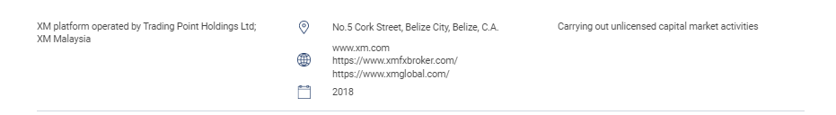 «данный раздел содержит список неавторизованных веб-сайтов, инвестиционных продуктов, компаний и частных лиц. В этот список входят: лица, осуществляющие или выдающие себя за осуществление следующих регулируемых видов деятельности без лицензии SC: операции с ценными бумагами; операции с деривативами; управление фондами, консультирование по корпоративным финансам, консультирование по инвестициям, финансовое планирование и участие в частных пенсионных схемах, лица, работающие на признанном рынке без разрешения, лица, выпускающие или предлагающие ценные бумаги без одобрения, разрешения или признания, лица, злоупотребляющие логотипом sc и представляющие ее в ложном свете. " XM платформа, управляемая Trading Point Holdings Ltd; XM малайзия № 5 корк стрит, город белиз, белиз, ca www. XM .ком https://www. XM fxbroker.com/ https://www. XM global.com/ 2018 осуществление нелицензированной деятельности на рынке капитала