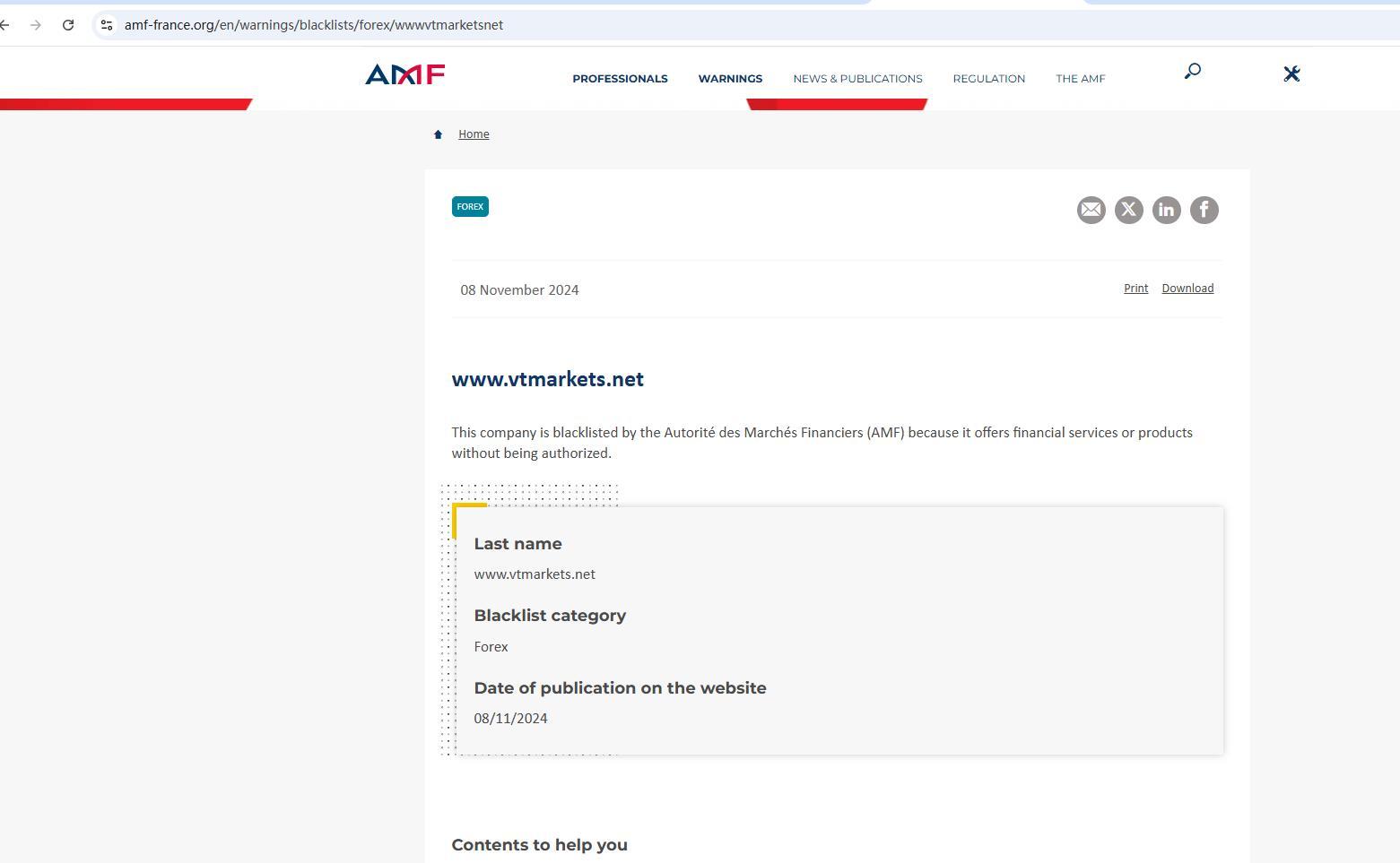 www.vtmarkets.net Эта компания занесена в черный список Autorité des Marchés Financiers (AMF), поскольку она предлагает финансовые услуги или продукты без авторизации. Фамилия www.vtmarkets.net Категория черного списка Forex Дата публикации на сайте 08/11/2024