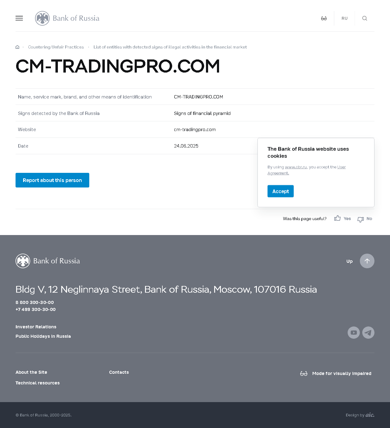Список организаций с выявленными признаками незаконной деятельности на финансовом рынке CM-TRADINGPRO.COM.