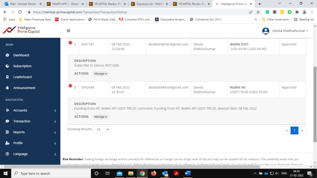 Email: devdashekhar@gmail.com Issues description: I have subscribed Genius bot on 8th February, 2022 during Valentine's Promo offer, however it is still showing unsubscribed, further the user is still not able to transfer his capital in MT4 account and the user is not able to use the IPC autonomous trading feature since last one-week, kindly look into and resolve his issue. TXID (deposition issues): 85c117395b034ec06a7f206143a1763ad0fb66aa66ba4455bb2bd05ae2f18939 IPC wallet address: TArXKFcHgi9K1GsaxuZad1MUuZcNMUihsj Own wallet address: TB4zMdnkqyDjzfiev4icavWxmLL9s2fb7V