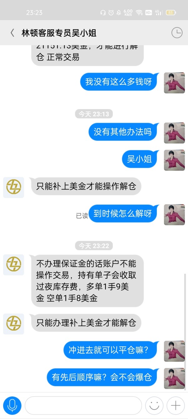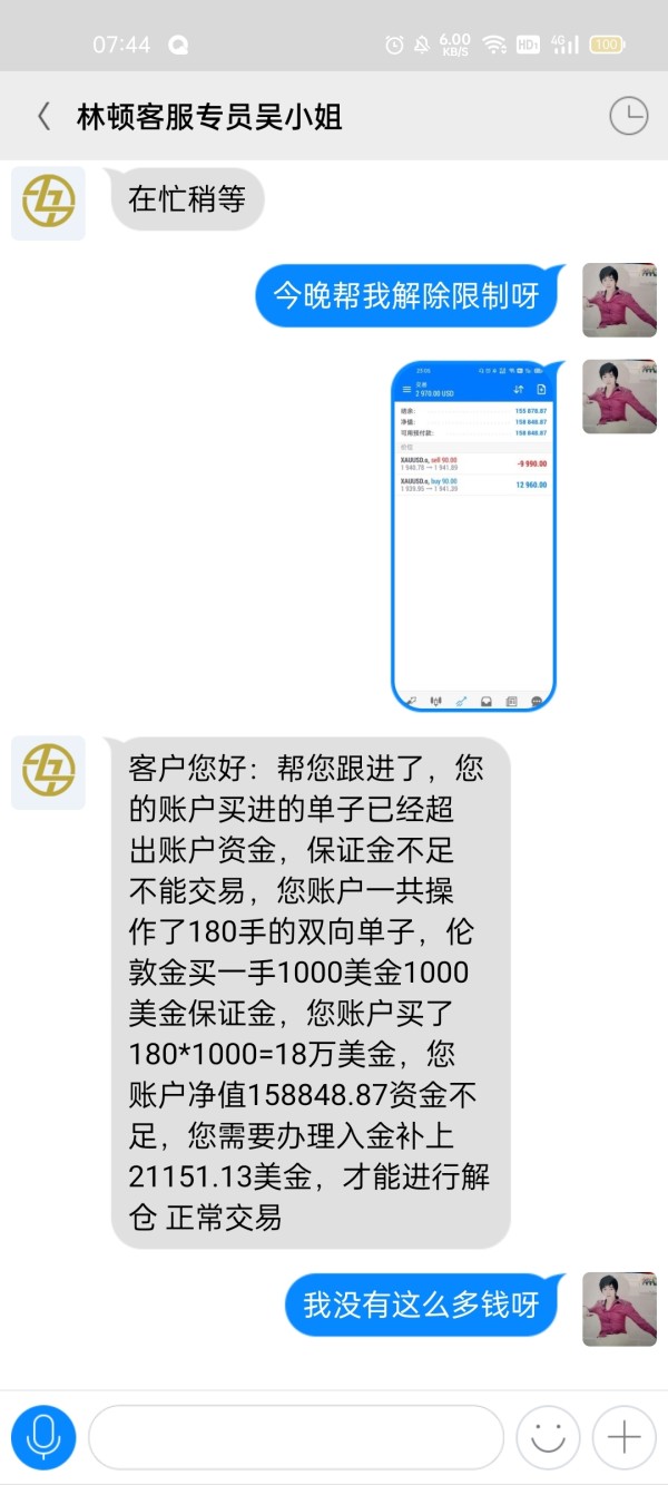 之前在微信企业群,每天分析股票操作。后来进了林顿金融聊天软件,让我们下载MT,充钱操作期货黄金,而且账号都是分析师操作。本金2万美金,承诺五个工作日翻倍。后来资金到达5万美金,2022.3.31重仓操作双向单子180手,导致锁仓,需要追加保证金才能解仓。