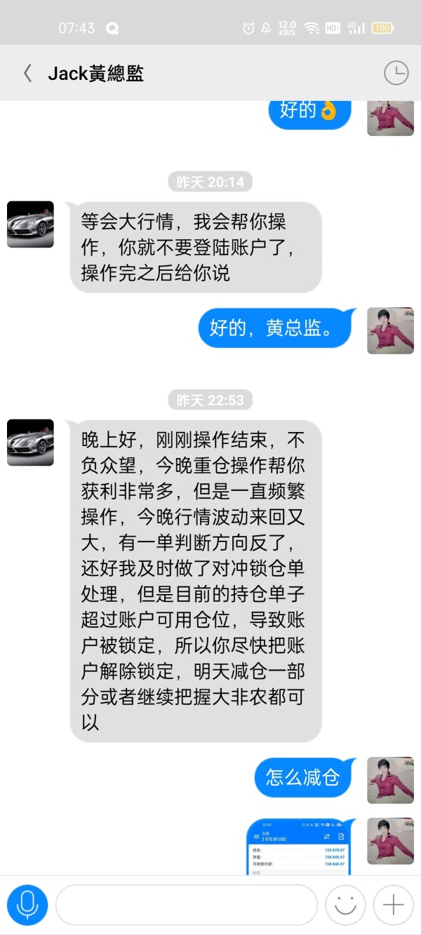 ฉันอยู่ในกลุ่มวิสาหกิจ Wechat และมีการวิเคราะห์การดำเนินการสต็อกทุกวัน จากนั้น ฉันเข้าร่วมแชททางการเงินของ Lindun และขอให้เราดาวน์โหลด MT และฝากทองคำเพื่อซื้อขายในอนาคต บัญชีนี้ดำเนินการโดยนักวิเคราะห์ หลักการของฉันคือสองหมื่นดอลลาร์และสัญญาว่าจะเพิ่มเป็นสองเท่าใน 5 วันทำการ จากนั้นเงินทุนของพวกเขาถึงห้าหมื่นดอลลาร์ ในวันที่ 2022.3.31 เขาดำเนินการคำสั่งสองเทรนด์ด้วยตำแหน่งที่หนัก 180 ล็อต และทำให้สถานะถูกล็อค ต้องใช้ระยะขอบเพิ่มเติมเพื่อปลดล็อก