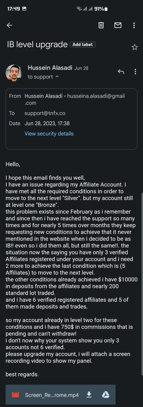 Hello, I have a problem with TNFX regarding my IB account, they refuse to upgrade it and ignoring my request and email. i Have achieved all the requirements to upgrade to level 2 ( silver / rebate 6$) [the level on the website in my dashboard is an error they said]. i have 6 verified accounts and approximately 200 standard lots traded, and $10,000 deposit. so as you see it's more than the requirements. now they say you need 3 more accounts to achieve the condition!!! fully scam. this problem nearly since February, and i can't withdraw the commissions.
