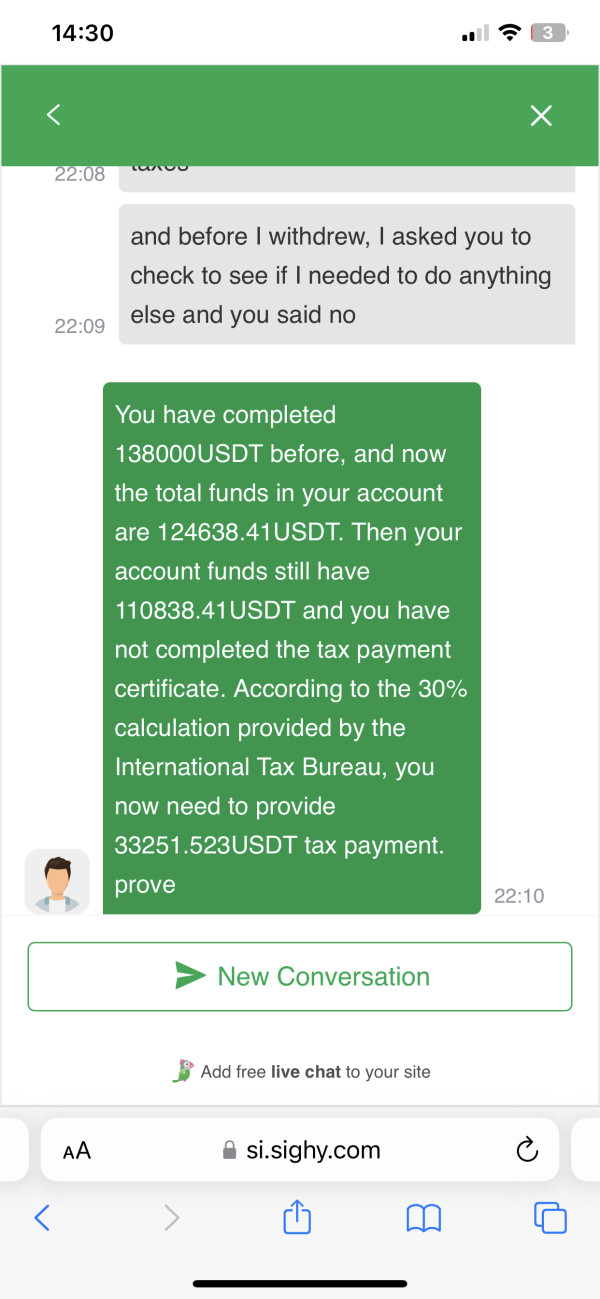 tôi tham gia sàn từ đầu tháng 11 qua 1 người từ whatsapp tên Anne, mấy lần giao dịch đầu tôi chỉ nạp vào 100 đến 300 thì tôi vẫn rút tiền bình thường, đến lần thứ 3 tôi rút khoảng hơn 3k và sau đó chờ rất lâu nhưng vẫn không rút được tiền, tôi hỏi nhân viên thì nhân viên bảo phải nạp thêm tiền để đạt đủ số tiền được rút là hơn 7k. Sau khi tôi nạp tiền và nhân viên bảo ok rồi thì vì buổi tối bạn kia có nhắn tôi có 1 nút giao dịch vào buổi tối nên tôi đã chờ sau khi giao dịch xong sẽ rút. lúc tôi rút tiền thì nhân viên lại bảo tôi phải nộp thêm 30% số thuế để làm xác minh thuế và sau đó tôi sẽ rút được toàn bộ tiền của mình. Sau khi tôi hoàn thành việc nộp thuế là 4k thì vẫn không rút được tiền do sàn tự động giảm điểm xuống còn 70. và tôi phải tham gia vào giao dịch để có thể nâng điểm lên. Lúc này bạn Anne kia giới thiệu cho tôi một người tên Jason là chuyên gia về tiền ảo, sau đó tôi được thêm vào 1 nhóm giao dịch gồm 5 người. Ở đó tôi được thông báo, phải tăng số tiền trong tài khoản lên thì mới có thể tham gia vào giao dịch tăng điểm, lần 1 đạt 25k điểm tăng 7 lần 2 đạt 42k điểm tăng 8. nhân viên bảo tôi chỉ cần đạt đến 85 điểm tôi có thể rút tiền, nhưng khi tôi đạt đến 85 điểm thì nhân viên lại nói hệ thống cập nhật và phải đạt đến 100 điểm. Và ông Jason này yêu cầu phải đạt tiền trong tài khoản lên đến 85k thì mới có thể tham gia giao dịch và ông ta cam đoan chỉ cần đạt 100 điểm là tôi có thể rút tiền. nhưng sau đó khi tôi đạt đến 100 điểm nhân viên lại bảo lệnh rút tiền của tôi vẫn không thể thực hiện vì chưa đóng số thuế còn lại là 33k. Tôi đã mất rất nhiều tiền. hãy giúp tôi. sàn này tên là SIG
