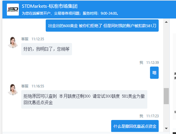 从2019年3月1号起 多次出金1000美金不给审批,与标准外汇客户经理王某QQ :1649403192 发生语言激烈交锋,今日2019年3月8日达到高峰,其撤回本人账户原先的返佣资金,581美金,禁止账户出金 经询问,标准外汇每月账户出金额度仅为2100美金,(PS 每人每天只能通过人民币方式出金1次,额度上限1000美金)。同时将我的标准外汇账户禁用 ,不给登录,无法查看详细交易记录,立贴以为警示,各位投资者朋友远离标准外汇,保护资金安全。本人账户累计盈利不会超过4000美金。保护自己,请记录好每天的资金变化。