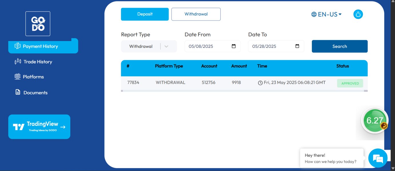 Review: Warning About My Experience with GODO and Mr. Taha I want to share my negative experience with GODO, specifically with the contact person Mr. Taha. Initially, he offered several attractive conditions like zero slippage and fast execution, which convinced me to deposit funds. I deposited $10,100, but unfortunately, I never saw any positive outcomes. After a few small trades, my capital reduced slightly. On realizing this, I decided to request a withdrawal of my remaining capital amount: $9,918 — this request was made five days ago. However, I have not received any money in my wallet. Although the withdrawal status shows as "approved," the funds are still missing. What's more frustrating is that Mr. Taha has completely stopped responding to my calls and messages. At this point, I strongly advise others not to open an account with GODO. I'm currently facing withdrawal delays for more than 5 days, and there is no proper communication or support from their side.
